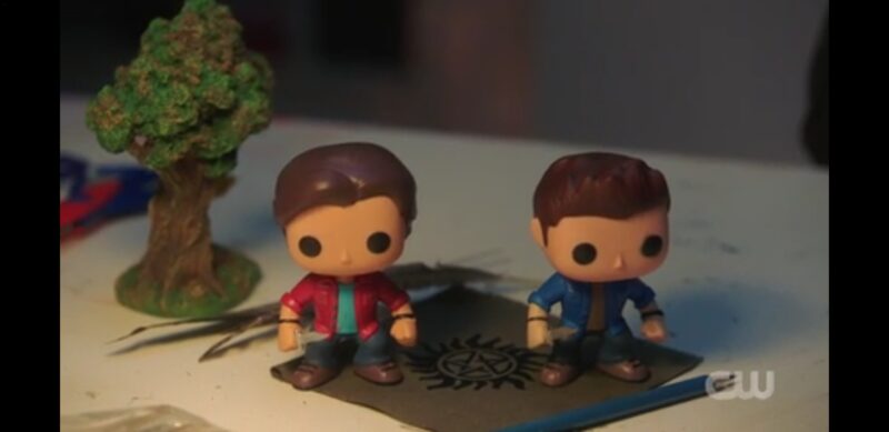The episode ends with Chuck having clearly made himself at home in Becky’s house. He’s writing at her computer, smiling to himself, as his little bout of writer’s block seems to be over. “This is gonna be good,” he grins as he types away. The camera pans to the desk where little Sam and Dean bobble-heads sit atop an anti-possession sigil with a tree and a black feather in the background.