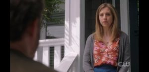 We meet a lovely little family somewhere in the suburbs. There’s a couple of kids, a nice looking dad, and a sweet mom…wait…is that Becky Rosen? It is Becky! You remember Becky, right? She was the original Supernatural super fan from early seasons who used to be really wacky, but now she seems…normal. She’s saying goodbye to her family, who are heading away from home. As they drive away, she suddenly spots Chuck standing across the street staring at her. Obviously not thrilled to see her old flame again, she starts to run away, but Chuck immediately follows, calling out to her that he just wants to talk. He’s had a rough couple of weeks and has nowhere else to go, and his demeanor, strangely, is different here. Becky stops and listens to him. Chuck seems sort of distraught and lost.