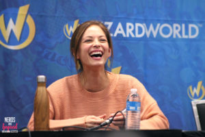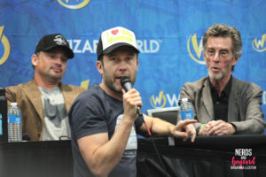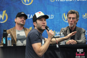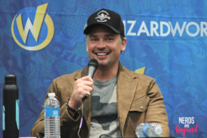 The first Smallville panel was titled “Archrivals” and consisted of Tom Welling, John Glover, and Michael Rosenbaum. The technical difficulties persisted from the Cary Elwes panel, leading Rosenbaum to leap off the stage and play the role of tech support hero for Wizard World; oh, the irony! This panel was one of our favorites of the weekend, partially because of the nonstop banter between the three men. Both Welling and Rosenbaum touched on how professional Glover always was on set and how great of an actor he is. At one point during the conversation, Welling told fans a story about the time he had been filming a scene with Glover when he took a longer pause in his dialogue that he [Welling] hadn’t anticipated, so he thought his scene partner had forgotten his line. He thought he was being helpful by saying Glover’s line, something he revealed Rosenbaum would occasionally do for him, but Glover looked at him and stated, “I know … I was acting.” The crowd spent 90% of the panel laughing at this and similar memories as the actors reminisced about their time on set and their scene partners.