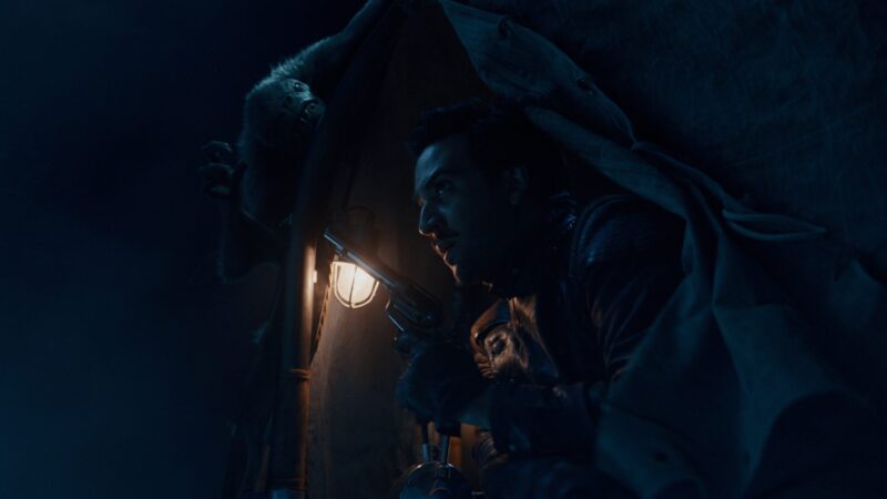 The epic final scene of the episode begins with everyone asleep on the balloon. Lee wakes to strange sounds and becomes suspicious, drawing his gun. The balloon is attacked by creatures known as cliff-ghasts and Lee manages to shoot a few of them. However, more attack and during the fight, the balloon tips and Lyra falls against the hatch in the side of the balloon. The hatch swings open and Lyra manages to cling to the side but is left swinging precariously off the side of the balloon, high above the mountains. Lee yells for Lyra to grab his hand, but her grip on the handle slips and she falls, screaming, as the episode ends.