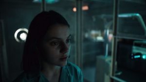 Dr. Cooper then enters the cafeteria and calls for a girl named Bridget. Bridget is led away and we follow her down a menacing corridor. The scene looks like something straight out of a horror film complete with steel walls, flickering lights, and a creepily smiling nurse, Sister Clara. Dr. Cooper walks past Sister Clara and snaps her out of her reverie by snapping her fingers at her.