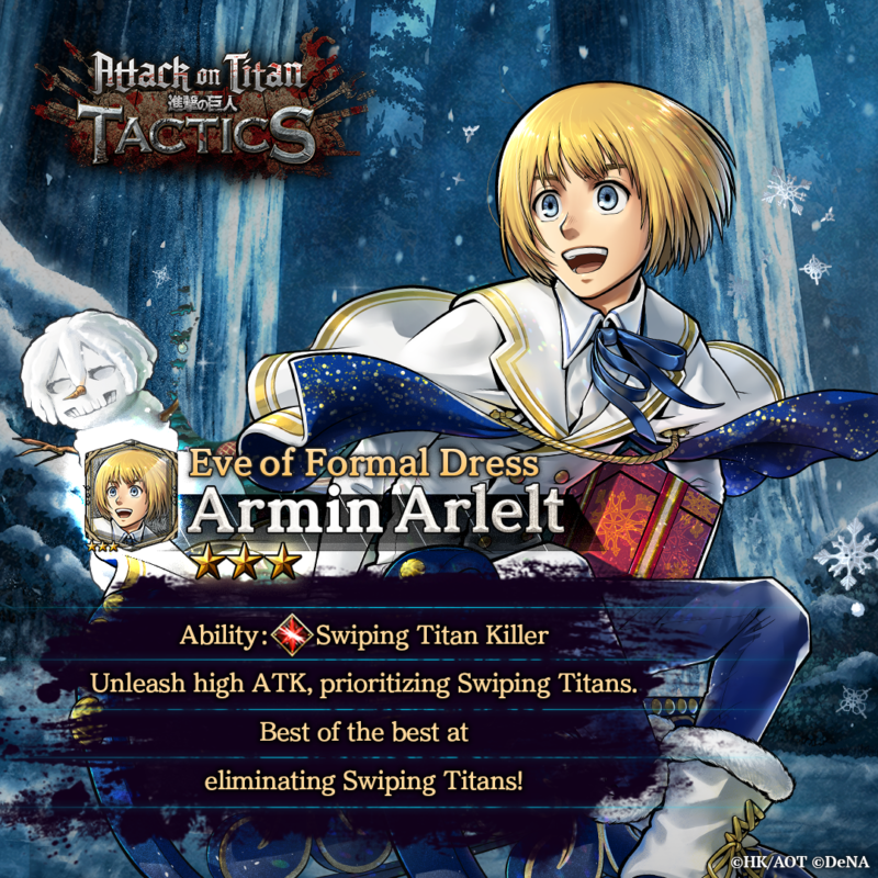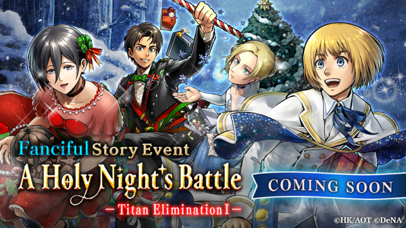 Beginning December 10, there will be holiday versions of the characters Eren Jaeger and Annie Leonhart. There is also the Fanciful Story Event – Holy Night’s Battle, which is an original story that is set in the time when Eren was in the 104th Cadet Corps. Everyone is tired from training and is excited and looking forward to celebrating and holding a festival for the holidays. Armin leaves and goes beyond the Walls to find the particular tree that they need. Players can complete event stages for rewards that can be used to add the Eve of Formal Dress version of Armin.