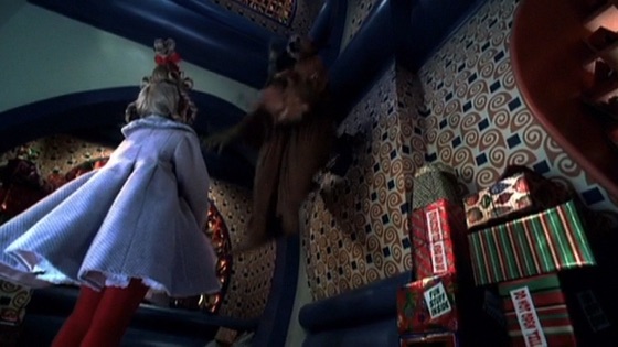 The Whobilation is all fun and games until presents are passed around, and Mayor May Who gives the Grinch a gift that reminds him of his not-so-fun school days and ruins the festivities. The Grinch, deciding that all of Whoville must pay, dresses up as St. Nick (during which a great rendition of “You’re a Mean One, Mr. Grinch” plays in the background) and makes Max an unofficial reindeer and steals Christmas from Whoville. When The Grinch, or “Santa,” gets to Cindy Lou Who’s house, Cindy Lou wakes up and meets him downstairs. The Grinch makes up a story that one of the lights on the tree went out, so he’s taking the tree up to his workshop to fix it and is bringing it back down when he does.