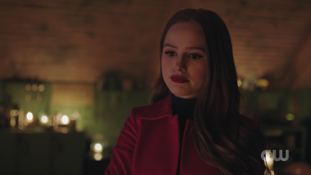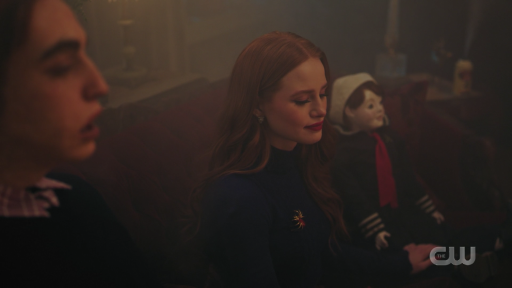 Penelope wakes up tied to a chair, Cheryl, Toni, Nana Rose, Jason, and Julian sitting in front of her. Cheryl tells Penelope that gassing herself to an early grave was just a ruse. She asks Penelope if she remembers when she was a little girl, and she used to read her Alice’s Adventures in Wonderland. Penelope would ask Cheryl if she thought she was Alice, and Cheryl would say, “No, Mother, I’m the Red Queen.” Cheryl says she’s going to do to Penelope what the Red Queen did to Alice; she is putting her on trial. The charges are as follows: “Prolonged gaslighting in hopes of driving me cuckoo-bananas, attempted murder of Archie, Betty, Veronica, and Jughead, and actual murder of my father, Clifford Blossom, Claudius Blossom, and Hal Cooper, among others.” Cheryl asks Penelope how she pleads.