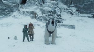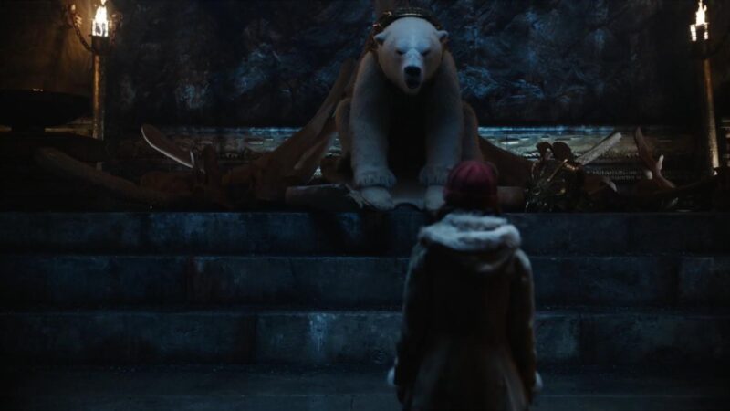 In the mountains, Lyra is in the snow after falling out of Lee’s balloon. She’s only a little bruised and immediately calls out for Iorek and Lee. She walks through the mountain pass and sees a bear who she assumes is Iorek. But it is a different bear, and Lyra backs away as it comes towards her, growling.