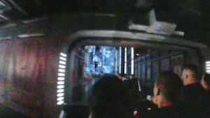 You are then lined up and given a color (which will later coordinate with the vehicle you will ride). Then you are moved into a triangular cell room where General Hux and Kylo Ren discuss their interrogation. They tell all guests to stay in the room and await their interrogation. When they leave, the walls begin to cut open! The Resistance have made their way in and are rescuing you! You then board a hijacked First Order Fleet Transport piloted by an R5 unit. The unit will take you to an escape pod to return to Batuu, but there are some bumps along the way.