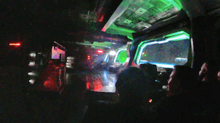 The transport ship reminds me of public transportation, like a subway, because travelers are standing and must hold on to the bars during vehicle movement. Motion is simulated but the monitors in the front and back of the ships make it appear like you lift off into space. When you enter, if you go to the right you will be closer to the front of the transport vehicle with Lieutenant Bek. If you go to the left, you will be closer to the back. The screens in the front and back are more like windows, so no matter where you are you are seeing something going on. There are also transmission monitors on both sides as well.
