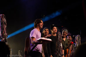 Switching again, American Authors took over for a song, doing an acoustic version of “Luck.” Though their lead singer, Zac Barnett, remained on stage, the rest of the band went through the crowd, adding a couple more instruments, mostly drums, for the second half of the song. The added bass from the drum made the song and the venue feel lively in a more visceral way; you could literally feel it as they were playing. Once the rest of the band made it back to the stage, they were joined by MAGIC GIANT for a cover of “Cecilia” by Simon & Garfunkel. (Who do I need to talk to about getting their version recorded and released?) Afterward, there was another quick intermission.