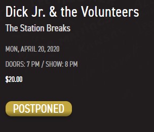 The Nashville show featuring Dick Jr & the Volunteers and The Station Breaks is officially postponed. Jason Manns briefly mentioned the postponement yesterday via Facebook livestream, and it’s now listed on the venue’s website.