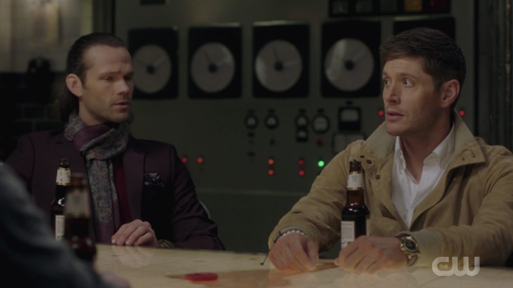 At the bunker, AU Sam and Dean are trying to be “authentic” Sam and Dean. AU Sam did not get rid of his manbun as his hair was “sacred”. All they had to do was drink beer in front of a computer screen. Dean notes that, “This Sam and Dean are simple but there’s no quarterly reports, no investors to answer to. All they have to do is hunt monsters and they have this place to their own… they have it made.” Yeah they really do. When AU Sam and Dean take off to Rio, however, they mention they saw a car when looking around while our boys were gone… but what car? Our Sam and Dean had Baby with them for the Church and Occultum. Perhaps its a plot for one of the last episodes remaining, or a plot hole for comedic purposes given Dean’s reaction to finding out they not only saw, but drove it.