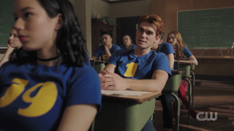 They’re Generation Z. Kevin begins singing “Random Number Generation,” followed by a classroom full of students, including Archie, Betty, Veronica, and Cheryl, wearing blue and yellow-numbered shirts. The students take their song and dance to the hallway, with full choreography and everything, trying to convince Principal Honey.