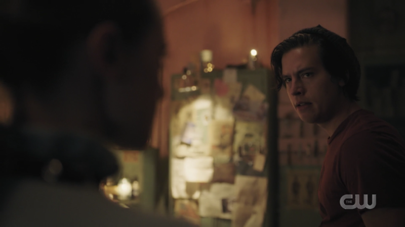 Meanwhile, Jughead’s in the bunker looking through tapes when Betty comes down. She came to surprise him with a study break. Is this what it looks like? Jughead’s not lying to her about doing his homework while he tries to crack some new unsolvable mystery? Jughead’s doing both, but Betty says she went to the mat for him, with Honey and with all of his teachers. Jughead didn’t ask her to do that, but Betty’s just trying to make sure that he graduates. “I’m trying to make sure that we stay together, that we have a future.” In what future are they not together? Jughead’s sorry; he’s different now. Jughead and Betty use “Exquisite Corpse” to get all of their anger out, kicking and throwing things in the bunker. Back with Archie and Veronica, Archie tells her he was trying to do the right thing, but she tells him he wasn’t thinking. “Give me a break, Veronica. It’s been a crappy year.” The two of them join in “Exquisite Corpse,” the Core Four all getting their anger out. Betty leaves the bunker, and Veronica leaves Archie’s room, both in rage.