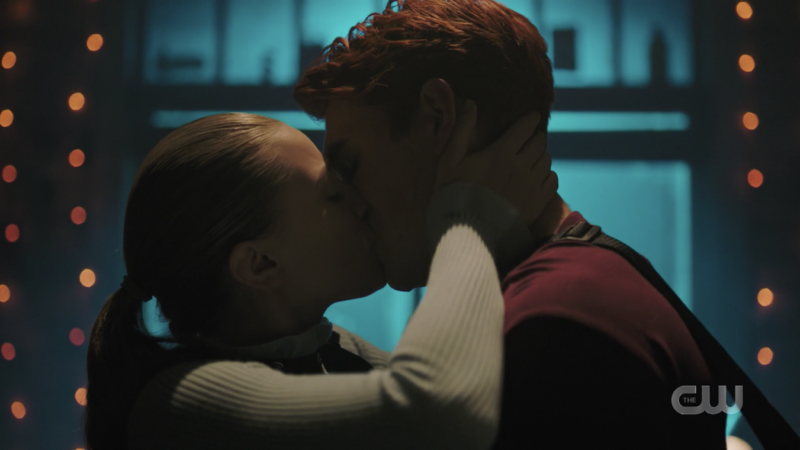 Betty shows up at Archie’s, apologizing for being late but Archie had forgot to text them that rehearsal’s canceled. Archie admits he kind of screwed up with Veronica, and Betty confesses that she and Jughead also got into a fight. Betty tells Archie that just because Veronica and Jughead aren’t there doesn’t mean they can’t rehearse. Archie starts playing guitar and sings “The Origin of Love,” Betty soon joining in. Veronica starts singing at the Pembrooke, and Jughead sings at the bunker after looking through another tape. Archie and Betty start getting closer, having flashbacks of the two of them, and they kiss.