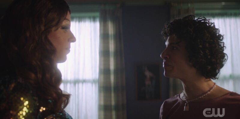 Jorge’s story begins when he was 14, describing his perfect man to Katy as “FDNY Hot,” which is exactly what he has in Bernardo. However Jorge is also trying to be friends with his ex, Buzz. Bernardo is visibly jealous at the thought of his boyfriend spending time with the ex, but should he be? The next day over tea and dry cookies, he and Buzz talk about drag and how Buzz has been keeping a watch on the crime reports. Jorge decides to give Buzz a drag-over, the internal and external makeover including the stage name, settling on the name “Prosocutie.” Jorge thinks he and Buzz spent an entire year in that bedroom but he never got to really see him. After reassuring Bernardo that the two of them are anchored, and there is nothing to worry about, Jorge vents to Pepper that he can’t stop thinking about Buzz.