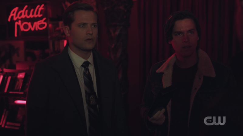 Charles asks Jughead if he solved the case, and Jughead tells him he had a hunch, but it didn’t pan out. He did, however, have another thought that maybe their suspect is not a Voyeur; maybe they’re a filmmaker. “Whoever made that video in the woods had to know what they were doing, and they even hired actors.” The fact that it’s all on videotape, Jughead says that’s the hallmark of a cinephile. Charles and Jughead leave to check out a theater, a record store, and a video store.