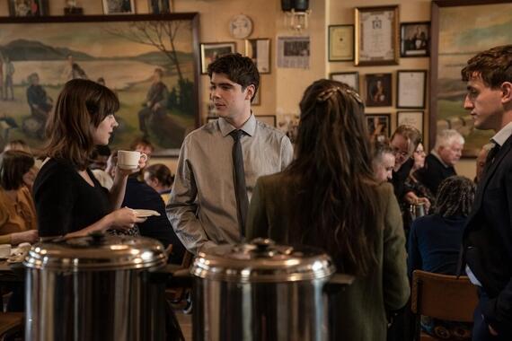 When they arrive, Marianne is there. He goes to her and they hug, reunited. They hug just a little too long for friends, and Helen definitely notices, tapping on Connell’s shoulder to end the embrace. After the funeral, they all head to a reception. Eric walks up to talk, and the introduction is awkward as Connell only says, “This is Helen,” with Helen left to clarify that she is his girlfriend when Eric asks. Eric tries to joke that Helen must be the reason they don’t see a lot of Connell anymore, but Connell says in a serious tone, “It’s not her fault, it’s my fault,” clearly feeling guilty for not being in Sligo more. Marianne approaches, and Eric remarks that it’s good of her to come all this way. He asks if she knows Helen, and she says she does. Eric, being Eric, says he hopes there’s no “rivalry” between the two women. All four sip their tea silently.