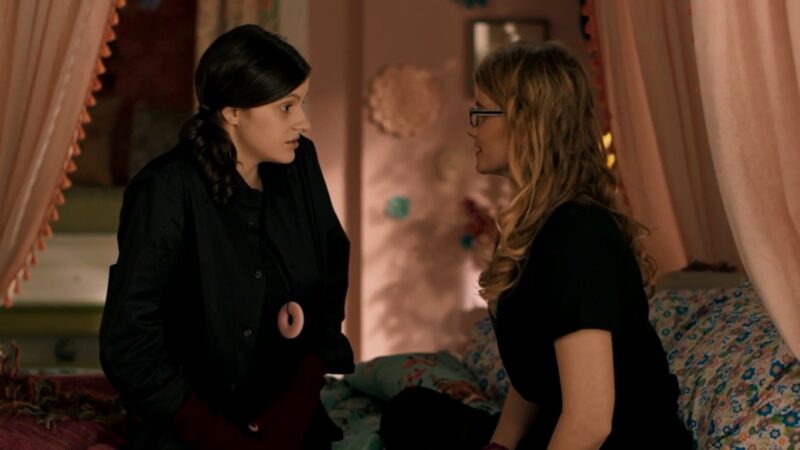 In the lovely episode “Monarch Butterflies,” we get to watch as Matilda and Drea’s relationship blossoms. Thomas stated in an interview with The Advocate that both are pansexual, but they aren’t concerned with labels and just let their love develop. Matilda wants their love to be like a movie, imitating gestures she’s seen onscreen like having Drea wipe stray batter off her face or staring at her through a fish tank in an homage to Romeo + Juliet. Drea, on the other hand, just wants to be with Matilda, who she loves. Drea tries to conform to what Matilda wants, trying on dresses that make her sensory issues worse because Matilda likes them on her and playing along with her rom-com aspirations. But the sweetest moment comes when Drea finally gets the courage to tell Matilda how she feels. Fidgeting, she tells Matilda she loves her. Matilda says she loves Drea too, and Drea is so overwhelmed with happiness that she calls over her service dog to help calm her down.