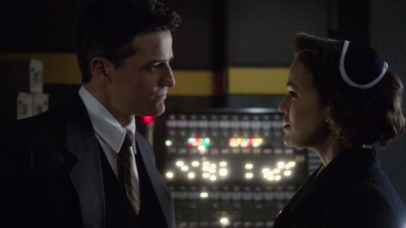 Deke and Daisy are looking through files upon files in a mess. Daisy picks up Daniel Sousa’s file, telling Deke that he’s Peggy Carter’s old partner. They both realize that Jemma and Coulson are in trouble. At the base, Sousa gets to the lab, where Jemma, aka “Peggy,” is talking to a scientist and laughing. Sousa calls for Agent Carter, and Jemma turns around. “Glad to finally put a face to the name.” Sousa acts as if he’s never met Agent Carter, saying he’s waited a long time. But he’s surprised to find her there, running a security op in their little patch of desert. Jemma says she believes the base may have been infiltrated. Sousa tells her to call him Daniel, saying he just flew in from LA. Jemma notes that he works in the old SSR office, and Sousa tells her that he’s in charge of it. Jemma slowly comes to a realization. “Daniel, your surname wouldn’t happen to be Sousa?” Sousa tells her it would. “Which would make you the former colleague of Agent Peggy Carter.” He again tells Jemma it would. He pulls his gun out, and Jemma supposes he’ll be arresting her now.