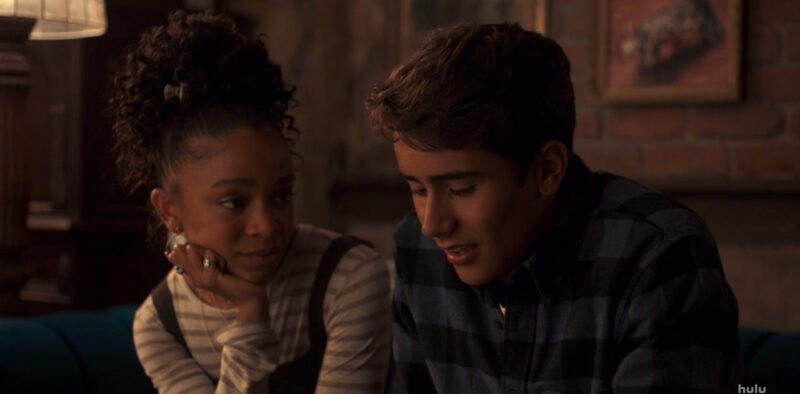 We start at the coffee shop with Victor, who’s reading his latest message from Simon talking about his celebrity crushes, empathizing with Victor learning about Benji seeing someone. Victor tries not to despair, though. He tells Simon that things are great: he and Benji are on the same wavelength at work, he’s found his people at school, he’s succeeding on the basketball team, and his family seems to be getting along.