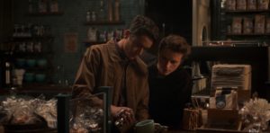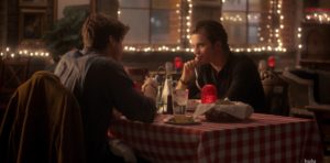 Next is a brief scene with Benji and Derek at the start of their date. Benji leads Derek, eyes closed, into the coffee shop where he’s set everything up, excited and proud of himself. When Derek opens his eyes, he’s surprised, but he doesn’t match Benji’s enthusiasm.