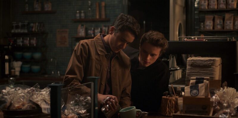 Next is a brief scene with Benji and Derek at the start of their date. Benji leads Derek, eyes closed, into the coffee shop where he’s set everything up, excited and proud of himself. When Derek opens his eyes, he’s surprised, but he doesn’t match Benji’s enthusiasm.