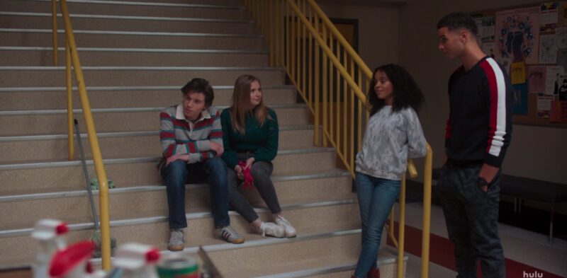 Back at Creekwood, Mia spies on Andrew and Lake while she scrubs marker off a wall. Felix points out a comment insulting another student, but Mia interrupts him by asking if he knew about Andrew and Lake. He doesn’t (of course) and gets upset. He goes over to them and switches with Andrew. He asks Lake about what Mia said, and she tells him Mia saw the hickey and assumed Andrew was the one who did it. Felix says he doesn’t want to mess anything up, but he’s worried Lake is embarrassed to be with him. She makes a joke about being “medium” embarrassed and still wants to secretly be with Felix. He doesn’t find it funny and walks away.