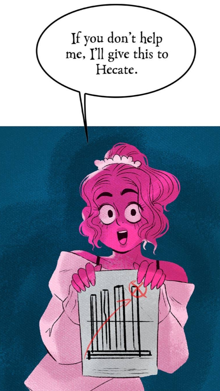 Persephone and Minthe have never been on good terms. On their first meeting, Minthe sends her to the Underworld Corp Tower 4, where she stumbles into Tartarus and is almost killed. We don’t see Persephone bring that moment up again, despite numerous chances for her to do so, until she needs something … and then uses it to blackmail Minthe into helping her. Being raised in the mortal realm left her without the computer skills she needed for her internship, and she was terrified of being under-qualified for the position. So, rather than face a potential failure, Persephone turned a little to her dark side.
