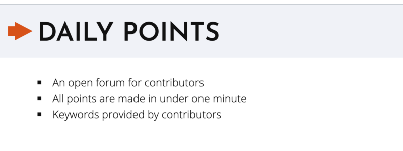 Daily Points are a bit different than the Starting Points. This is an open forum for contributors and answers must be kept to under 60 seconds. The keywords used at the top of the video are provided by the contributor.