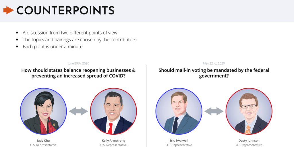Counterpoints is probably the most intriguing section. It features two officials, one from each party, who have paired up (the pairs are chosen by the contributors) to essentially debate on the topic of their choice. It’s a deeper exploration of these topics without the distractions of other voices chiming in. It’s a small exchange, ready and waiting for you to listen and make informed decisions with the information given.