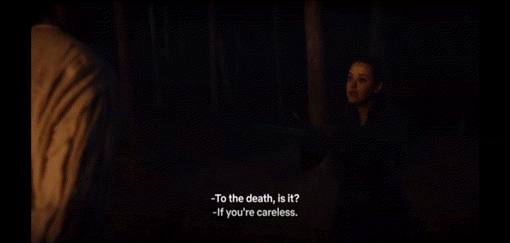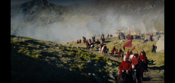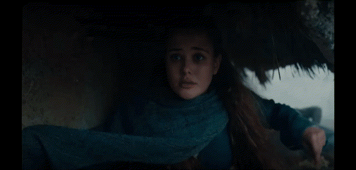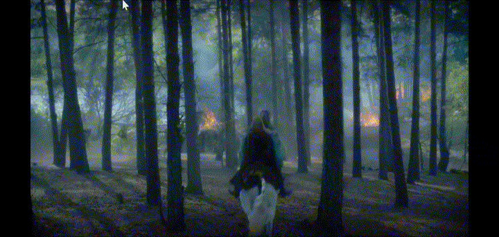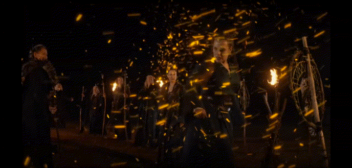 They rush to the village to find it on fire. The battle sequence that happens next is one of the most well-done action scenes I’ve seen since Game of Thrones. It’s all in one fluid camera motion, with allusions to Frank Miller’s artwork. Nimue and Pym are thrown from their horse and pulled away from each other as Pym screams. A shocked and terrified Nimue runs, looking for her mother. They don’t shy away from violence, showing the true power of the Paladins. Nimue watches her people die as she locks eyes with the Weeping Monk from across the carnage.