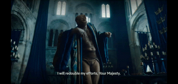 Uther Pendragon is getting reports of the Red Paladins’ misdeeds, which he is at first concerned by until one of his advisors, Borley, tells him the group has the support of the people. Most of them are blaming the Fey for recent droughts instead of him, which Uther is upset about as it implies some people blame him. Merlin is dragged in to explain the drought. He’s supposed to be making it rain, but Merlin just sarcastically says that the weather is fickle. Gustaf Skarsgård is very funny as he drunkenly stumbles around, trying to find excuses for his lack of magic. Uther points out that it is his people that are suffering under Carden and he should want to help them. Merlin says the prejudice against his people is far older than Carden. But if he could call upon the Shadow Lords, they might be able to slow Carden’s march. Uther is sick of his excuses and says to make it rain. Merlin mockingly bows as he leaves. But his mirth is gone when he finds dead birds arranged in a circle in his tower – echoing the birds Nimue saw earlier.
