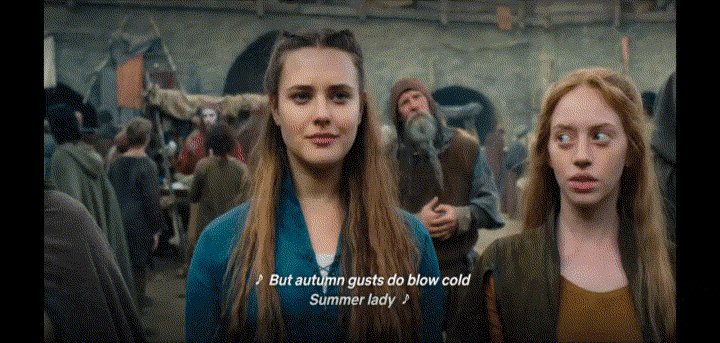 After the title sequence (fantastic animation reminiscent of Miller’s original illustrations), we see Nimue riding through a forest on her white horse. She hears whispers and sees crows flying ominously in a circle, but urges Old Boy on. She arrives at a village in the forest, where a young boy named Squirrel is quietly pick-pocketing from everyone. He offers her a drink from a stolen flask, but she refuses, knowing it’s not his. A woman walks by and hisses “witch” at Nimue, but Squirrel gets the last laugh as he immediately replies “piss off, half wit” (my new favorite way of telling someone to go away).
