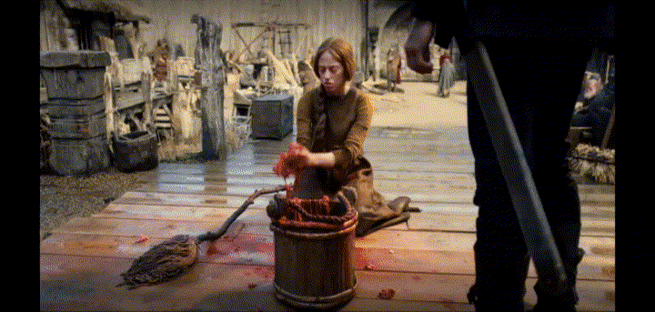 Poor Pym is stuck mopping up fish guts, until handsome raider Dof arrives. She’s dumbstruck by how attractive he is. She fakes having a backache so he’ll help her up and pretends not to know Aaron when he calls her (Pym is so relatable it hurts). As Dof leaves, she shoots Aaron a withering look. A drunk Merlin is boring Rugen to death, and he orders him taken away to sleep it off. But his antics were masking his true intent: to get the key to the room with the Fey Fire. Nimue and Arthur make their way through the forest as Arthur asks if the sword is really worth her life. She says it’s worth his too before stopping. She sees Dizier’s caravan stopped in the road. But they’re all dead, murdered by the Weeping Monk. They never made it to Nemos. Nimue sobs over Clothilde’s body and dry heaves when she sees Dizier, who was clearly tortured before he died. But the little girl Amvri isn’t there, and Nimue calls out for her, hoping she’s somehow alive. The woods begin to whisper to her, and she follows them.