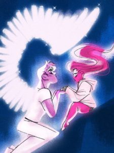 Lore Olympus is a webcomic created by Rachel Smythe that retells the story of Hades and Persephone with a modern twist and also features other stories from Greek mythology woven into the tale. She has a wonderfully unique comic style and is a masterful storyteller, which makes this a highly bingeworthy series. I strongly recommend reading the series before reading this article, as there will be major spoilers! It is important to note that while some chapters deal with adult themes, they’re all clearly labeled, so nothing should catch you off guard. The first season has wrapped up with 115 episodes, so to celebrate and look back on the series so far, I’m gathering some of the top moments from some favorite characters! So far we’ve done Persephone and Artemis, and this time we’ll be looking at Eros, the God of Love.