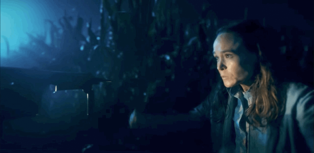 Elliott is … back on the team? One of his machines picks up the blast we can assume is from Vanya, and Five takes off. He finds her hidden in the corn, and she doesn’t remember him either. Five … isn’t as tactful as Luther and lays out her options: wait for the IKEA mafia to come back and find her or go with him — she follows him. He tries to explain the time travel and what exactly is going on as they enter a giant flattened patch in the field, a result of her powers.