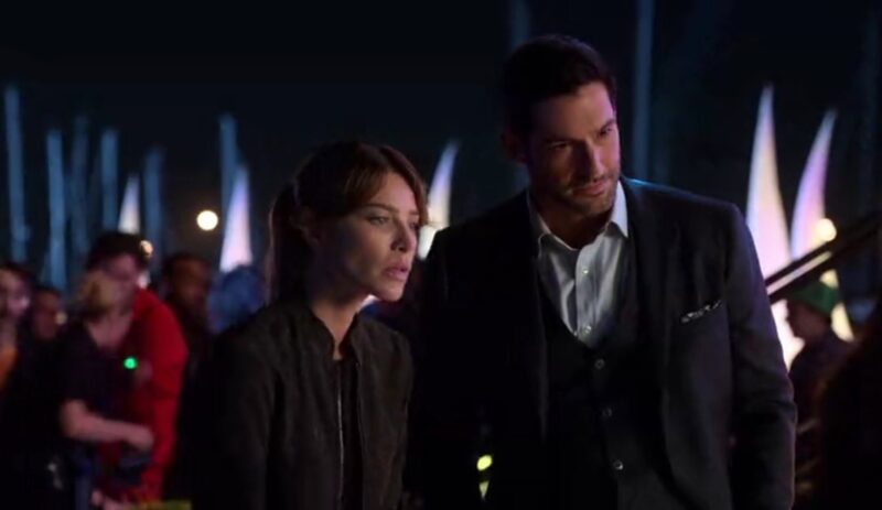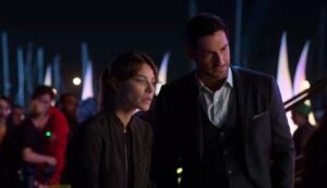 The episode starts with a couple kissing. For a few moments we think it’s Chloe and Lucifer, but it’s just two young concert attendees. A menacing figure is watching them and approaches the couple with a gun. Turn out, it’s just a water gun and the guy is a friend of the couple. They go back to the show together. We see a DJ Pexxa performing on stage with a huge crowd dancing and singing. The DJ dies on stage by electrocution, but the audience doesn’t realize it immediately.