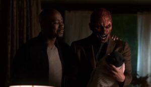 The baby is finally asleep when Dan comes to tell Lucifer and Amenadiel that the case is closed. Lucifer is furious at himself for not being there and doesn’t understand how he let Jed into his head. Amenadiel says he is jealous, which Lucifer denies. He tells the guys he is worried to mess it up before having a proper chance and asks Dan for advice. Dan tells him to just go talk to her. Charlie starts crying again and Dan wants to go to him, but Amenadiel and Lucifer send him back home to rest. As soon as he is out, Lucifer uses his devil’s face again, not knowing Dan saw everything because of the phone call he received from Michael impersonating Lucifer asking him to come back. Dan runs away while Michael is watching.