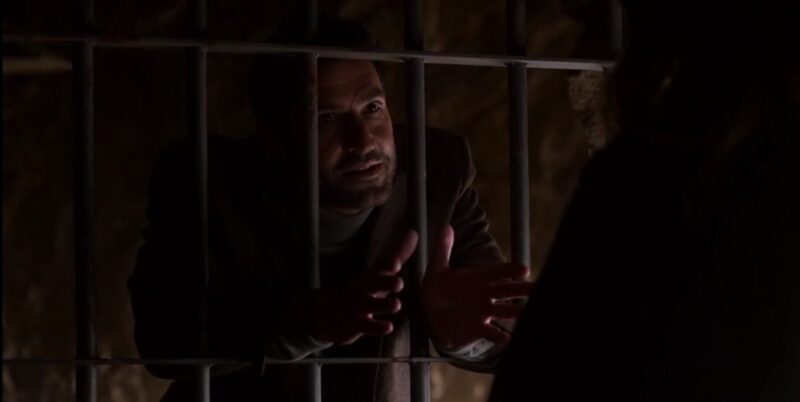 Next, we see Chloe. She’s in a cell somewhere, trying to get out, when Michael shows up. He’s brought a latte, which Chloe doesn’t want obviously. He talks about this being part of a bigger plan, “spoiler alert, it’s gonna be epic.” They have a back and forth in which they discuss how he exposes fear and that Chloe reeks of it. He also gives her a hard time that Lucifer hasn’t told her that he loves her. He then leaves, and Chloe is alone again.