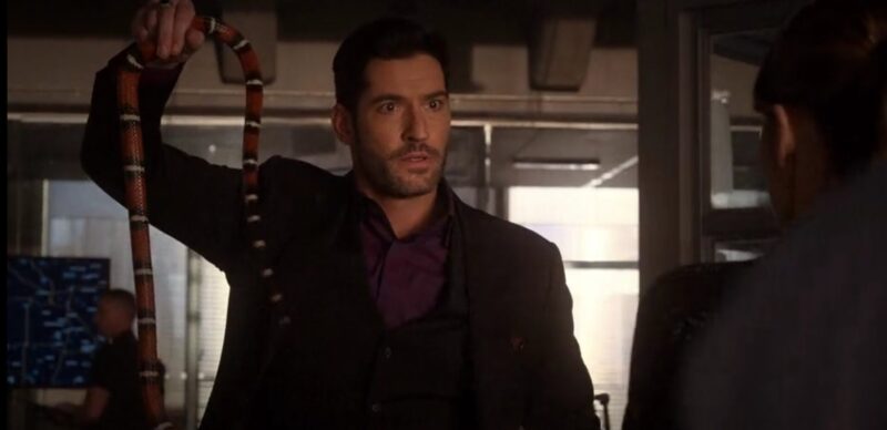 Ella and Chloe have a heart to heart up until Ella asks how long it took for Lucifer to tell Chloe that he loves her, then things get uncomfortable. Chloe says that every relationship is different and that Ella needs to realize that this is a good thing between her and Pete. Out of the corner of her eye, she notices Lucifer and excuses herself from the conversation to go to him. When she does, Lucifer is busy putting a snake in Dan’s desk as payback for shooting him, but Chloe talks him out of it.
