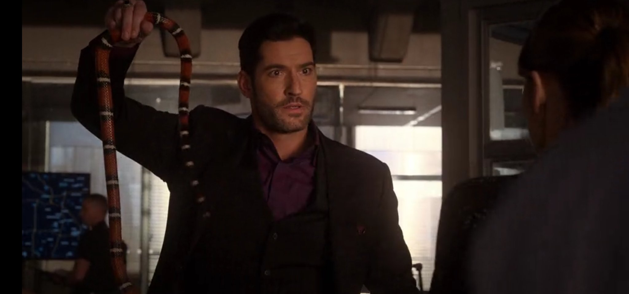 Ella and Chloe have a heart to heart up until Ella asks how long it took for Lucifer to tell Chloe that he loves her, then things get uncomfortable. Chloe says that every relationship is different and that Ella needs to realize that this is a good thing between her and Pete. Out of the corner of her eye, she notices Lucifer and excuses herself from the conversation to go to him. When she does, Lucifer is busy putting a snake in Dan’s desk as payback for shooting him, but Chloe talks him out of it.