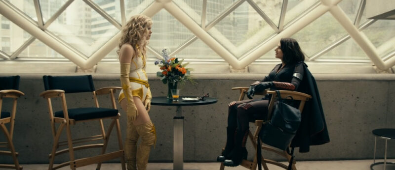 At Vought, Starlight is filming a tiring onslaught of news segments, and then she’s joined by Queen Maeve and Stormfront for photos for a press event. Ashley is later briefing them on the rest of their day when Maeve receives a phone call and leaves, citing a family emergency.
