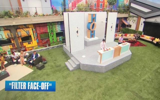After a quick commercial break, we return to see this week’s Head of Household (HOH) competition. Julie announces that there will be no have-nots this week. This competition is called Filter Face Off. They see all 16 houseguests faces with filters on them and will be asked questions that can be answered with more, exactly, or less. First one to buzz in with the correct answer will get to choose two others to face off. If they buzz in and are incorrect, they will be eliminated. If both houseguests don’t answer in time, both of them will be eliminated, unless it is the final round.