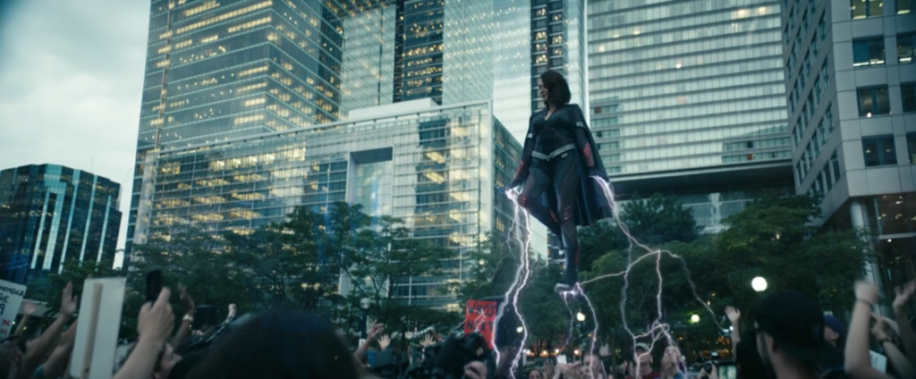 After revealing that her family took the (terrible) cash settlement that Vought offered them instead of going to the police (doubting their ability to win a case in the South with the word of a young Black girl versus a white Supe), she asks them not to tell anyone — Liberty will kill her if she finds out she opened her mouth. Hughie, confused, states that she’s probably dead by now. The woman laughs, and the other shoe finally drops. She brings over a newspaper that shows them that Liberty is alive and well … SHE’S STORMFRONT.