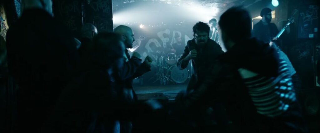 We cut to a bar, where a hardcore show is taking place (featuring Hamilton, Ontario’s own Dead Tired!) Butcher is drinking and wallowing in his sorrows after Becca decided not to leave with him. Being the self-destructive man that he is, he heads over to the mosh pit and decides to headbutt a guy in the face and starts beating him up. The crowd, happy to throw well-meaning punches and kicks at one another while moshing along to the songs, is less than impressed with Butcher and his unwelcome antics. They throw him to the ground and begin throwing kicks.