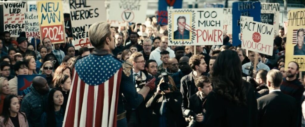 Ashley pulls Homelander aside to show him that an unfortunate and disturbing video of him has leaked. He was off on a mission in another country to take out a Supervillain, but he killed an innocent boy in the village in the process. Now, there’s been a significant amount of blowback over the video and protesters are standing outside of the Vought building, calling him a war criminal. As to be expected, Homelander wants to take care of the issue himself without PR controlling him. Ashley, however, informs him that Mr. Edgar and the legal team have stated that his official position must be “no comment at this time” until the crisis team comes up with a strategy.