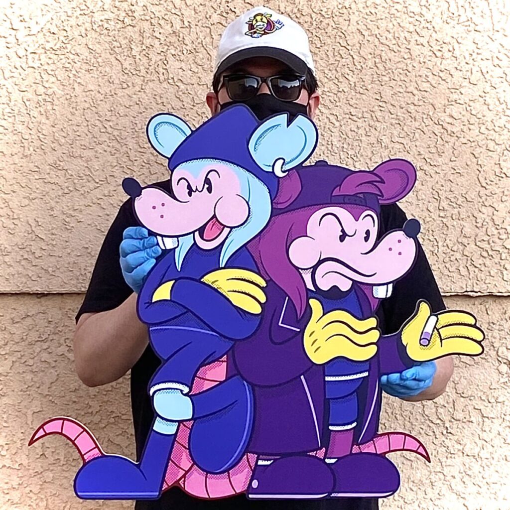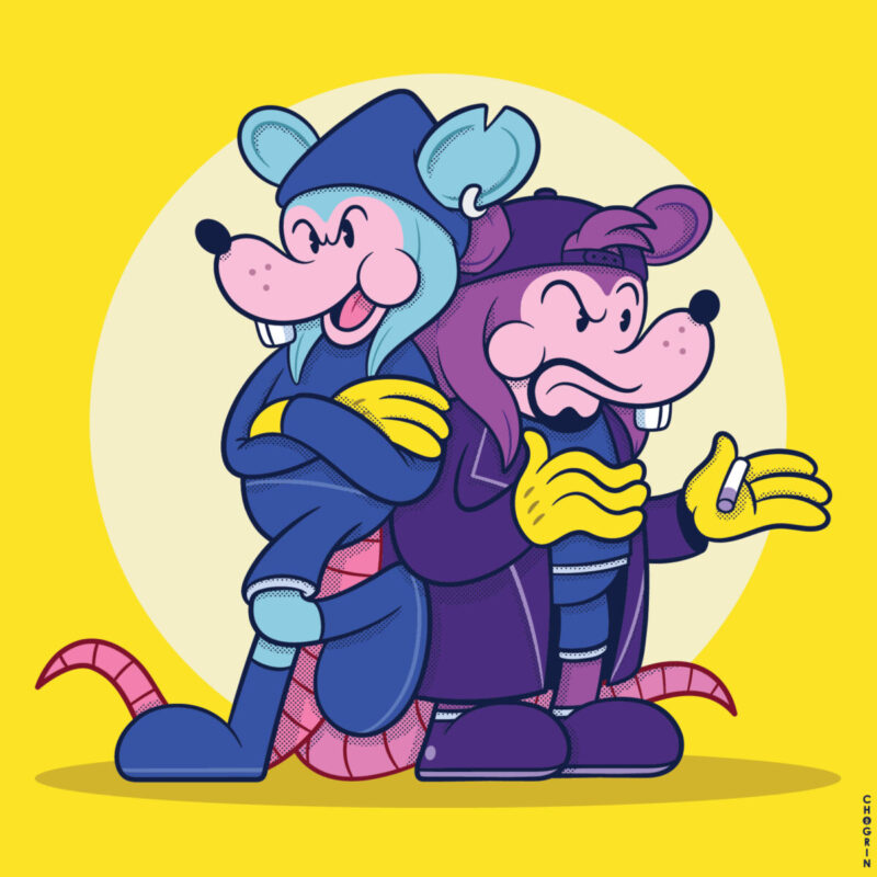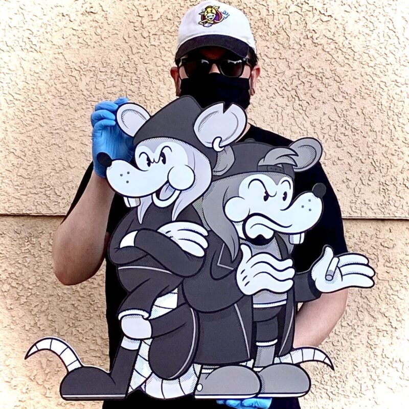 Starting tomorrow online at Gallery 1988, which is located in Los Angeles, California, at 12 p.m. PST, there will be a 25th-anniversary art show to celebrate the film with work from various artists. Among the artists will be Chogrin and his version of the iconic Jay and Silent Bob duo as actual rats. His design will be on prints, limited edition woodprints, magic eye prints, and toys that were a collaboration with The Beast Brothers and Mexican Bootleg. These editions will exclusively be available at the art show. You can see a preview of the designs below.