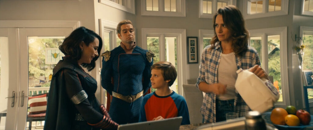 Meanwhile, at Becca’s house, Ryan is showing Homelander and Stormfront a LEGO version of the film The Blind Side that he made (spoiler alert: they’re not impressed). Stormfront, ready as ever to stir the pot, asks Ryan if he’s into any things that kids are into or if he’s seen his dad’s movies. Things get a bit messy as Becca and Homelander’s disagreement over the matter leads to Stormfront assuring Ryan that he’s certainly old enough for those movies, as well as sleepovers, baseball games, and even visits to Vought Land. Becca reaches her last straw when Ryan asks to go to the attraction and she tells him that they’ll talk about it, only to be overruled by Stormfront’s assuring response, “Whenever you want.”