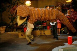 First off, we have the absolutely spectacular, and maybe a bit nerdy/cheesy, Halloween costumes worn both at the Buy More by the store’s staff and for the Halloween party in the final scene. Not only do we get to see Morgan and Chuck in what is described as their traditional Halloween costume, a sandworm from Dune — which is absolutely amazing and slightly touching as we see Chuck allow Morgan to be the front half of the worm for the first time — but we also get to see Ellie and Awesome in the ultimate couples costume: Adam and Eve. Plus, Sarah shows up as Princess Leia in her golden bikini to surprise Chuck, and at the Buy More we see Jeff and Lester dressed up as “American Gothic.” It is not often that you find a TV show that features such relatable, hilarious, and awesome costumes at a Halloween event, and I, for one, cannot get enough of it.
