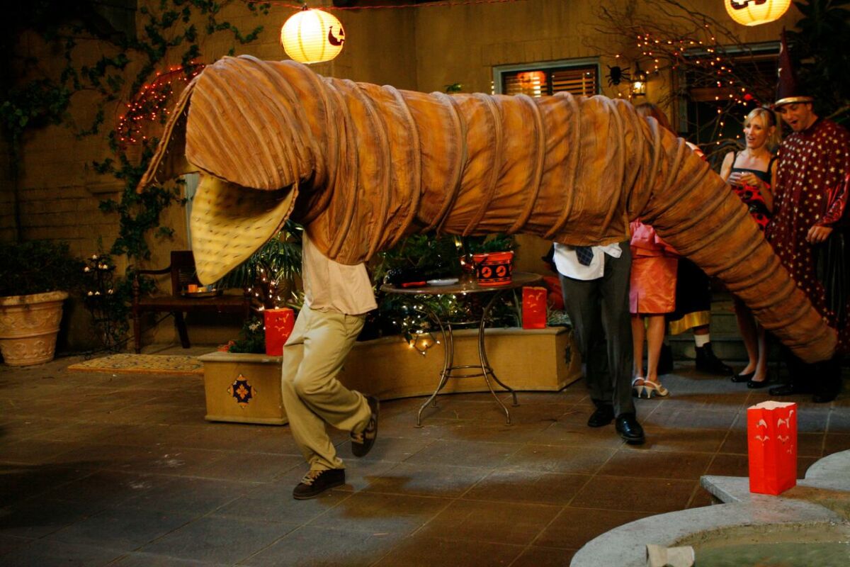 First off, we have the absolutely spectacular, and maybe a bit nerdy/cheesy, Halloween costumes worn both at the Buy More by the store’s staff and for the Halloween party in the final scene. Not only do we get to see Morgan and Chuck in what is described as their traditional Halloween costume, a sandworm from Dune — which is absolutely amazing and slightly touching as we see Chuck allow Morgan to be the front half of the worm for the first time — but we also get to see Ellie and Awesome in the ultimate couples costume: Adam and Eve. Plus, Sarah shows up as Princess Leia in her golden bikini to surprise Chuck, and at the Buy More we see Jeff and Lester dressed up as “American Gothic.” It is not often that you find a TV show that features such relatable, hilarious, and awesome costumes at a Halloween event, and I, for one, cannot get enough of it.