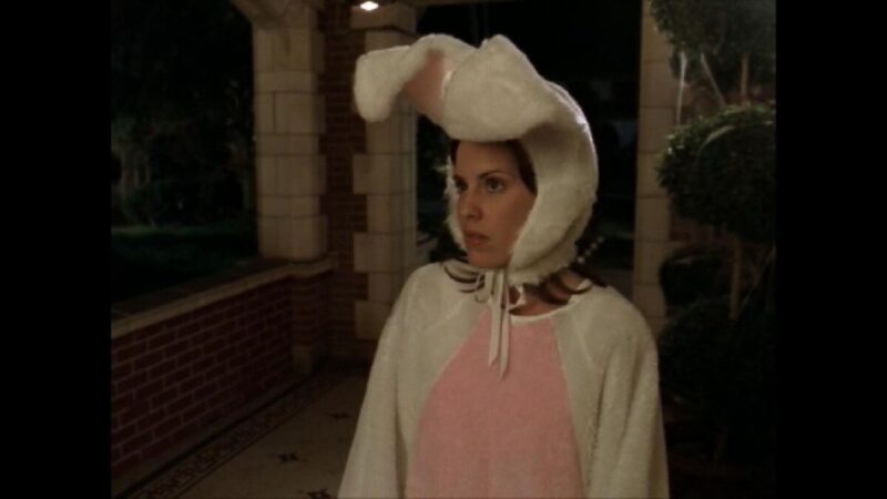 Anya (Emma Caulfield Ford) shows up wearing a fluffy bunny costume outside the house but cannot get inside. There should be a door where there is no door, so Anya runs off to get help. We later learn in “Once More With Feeling” why they creep her out. Giles and Anya get to the house, and Giles decides to create a door using a chainsaw, which is very Halloween.